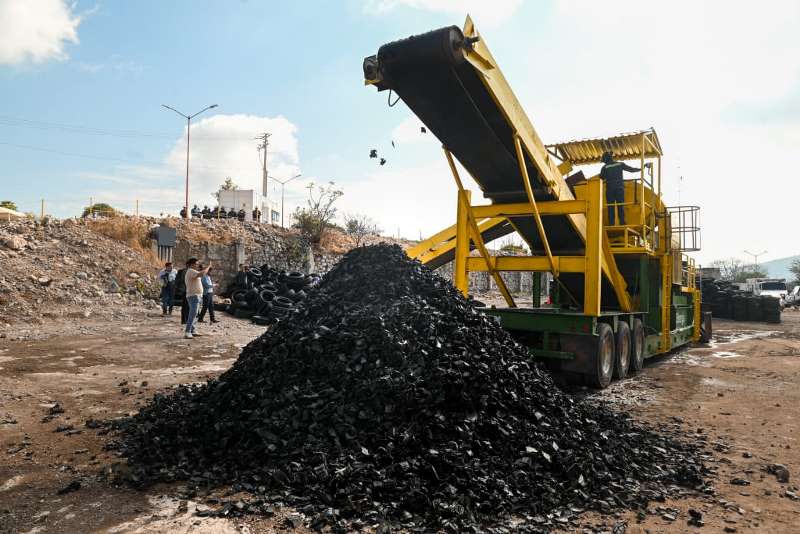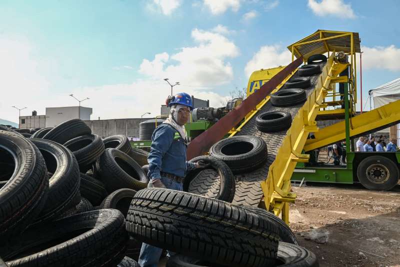 Al concluir el evento, la Gobernadora y las autoridades presenciaron una demostración del proceso mediante el cual los neumáticos son triturados para su posterior traslado a la planta de Tepetzingo, en el municipio de Emiliano Zapata, donde se convertirán en combustible alterno.